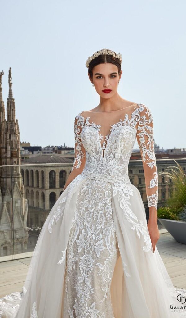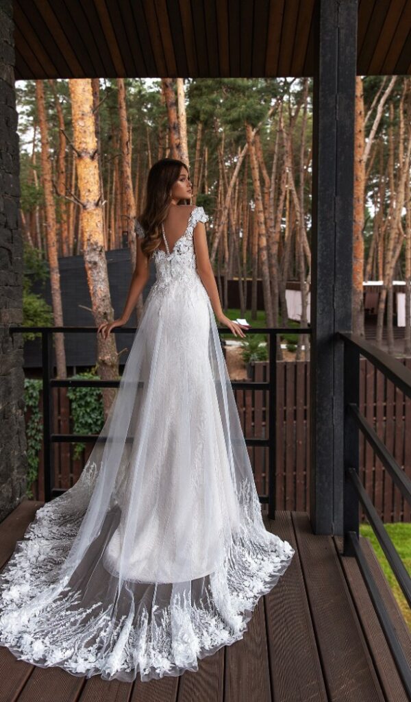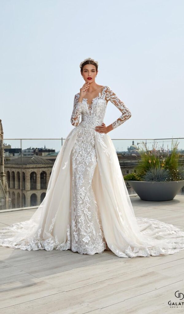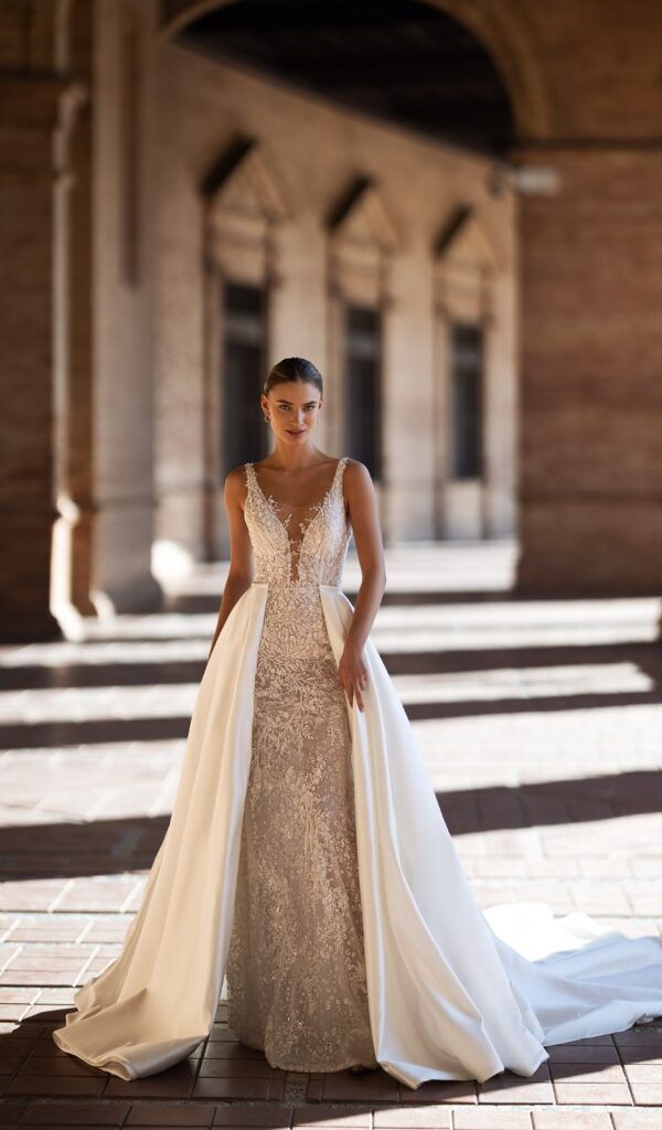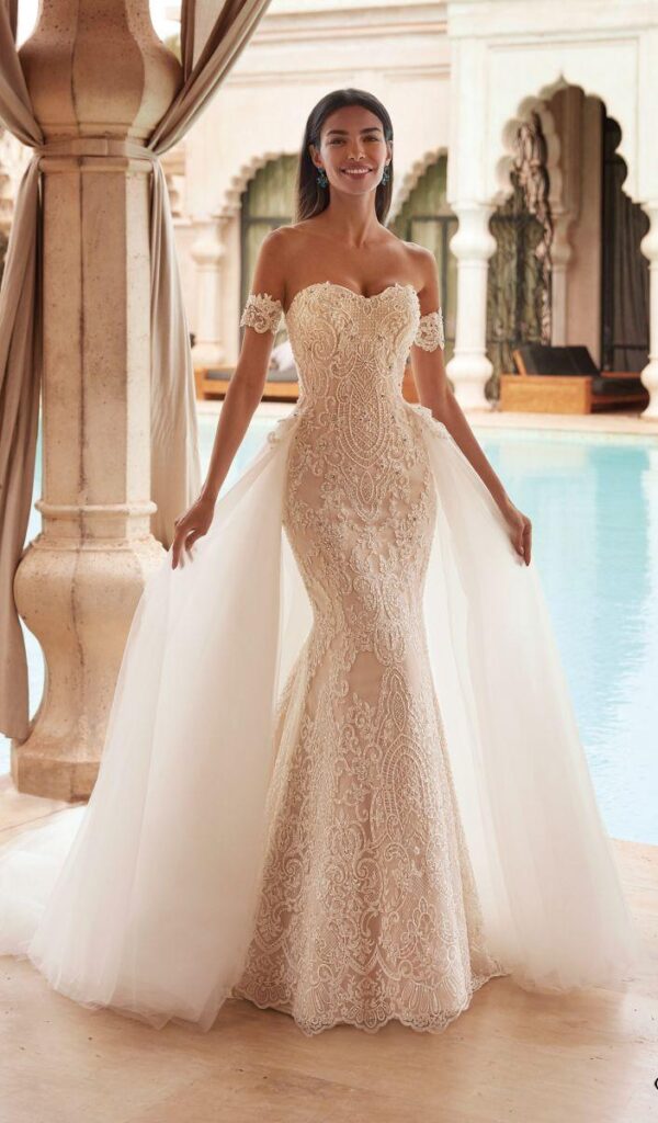 Algunos de los vestidos de novia sirena de la colección Mon Cheri incluyen una sobrefalda opcional, que se puede utilizar para cambiar el look del vestido. La sobrefalda puede ser de encaje o tul, y puede añadir un toque de volumen o elegancia al vestido.